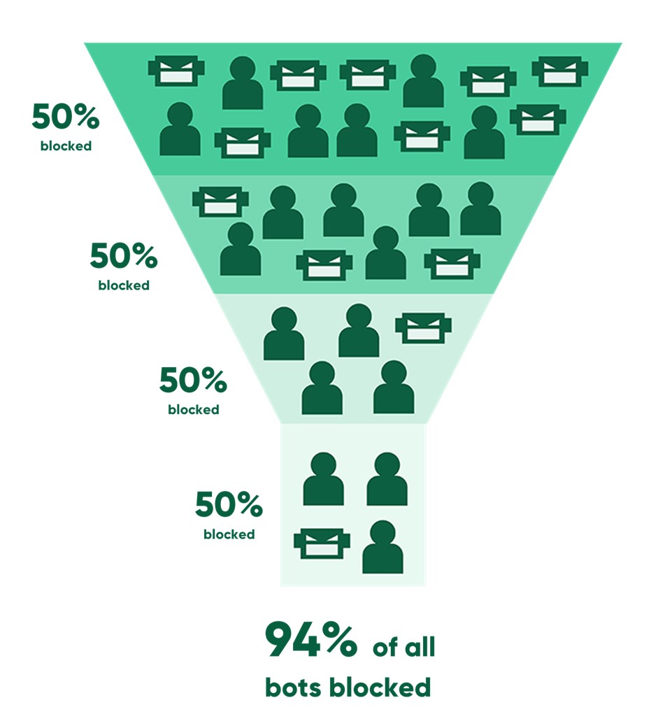 For example, if you have four layers of bot detection that each identify 50% of bots, 10,000 bots become 5,000, then 2,500, then 1,250, then 625. In this scenario, the multi-layered approach removes 93.75% of bots, even with tactics that only manage to detect 50% of bots each.