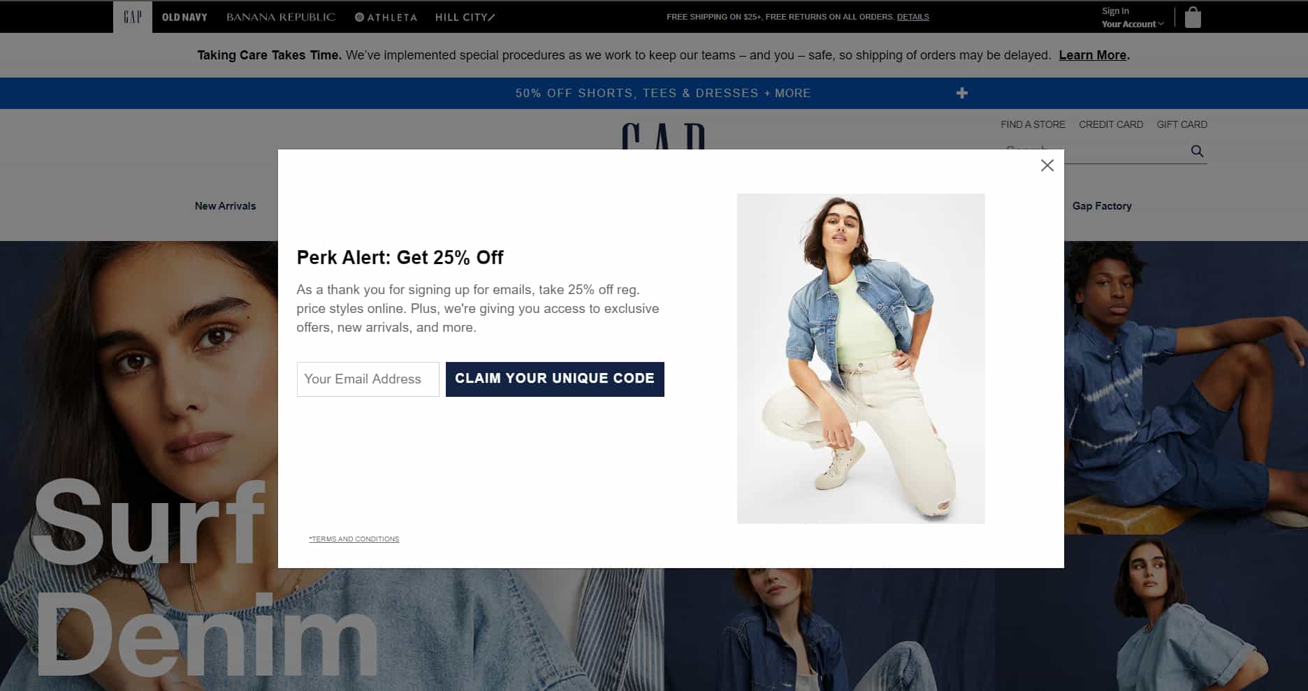 A popup on GAP's website that offers a discount for signing up to their email list.