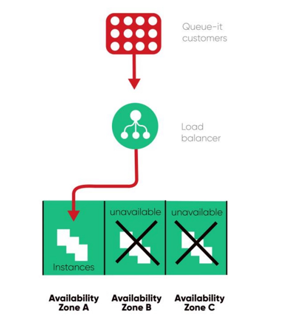 At Queue-it, we avoid SPOFs by hosting our service across 3 availability zones for each region we’re based in (North America, Europe, and Asia-Pacific). Think of these like having 3 engines in different parts of an airplane. In the (unlikely) event of a failure in 2 availability zones, Queue-it can still operate on the third.