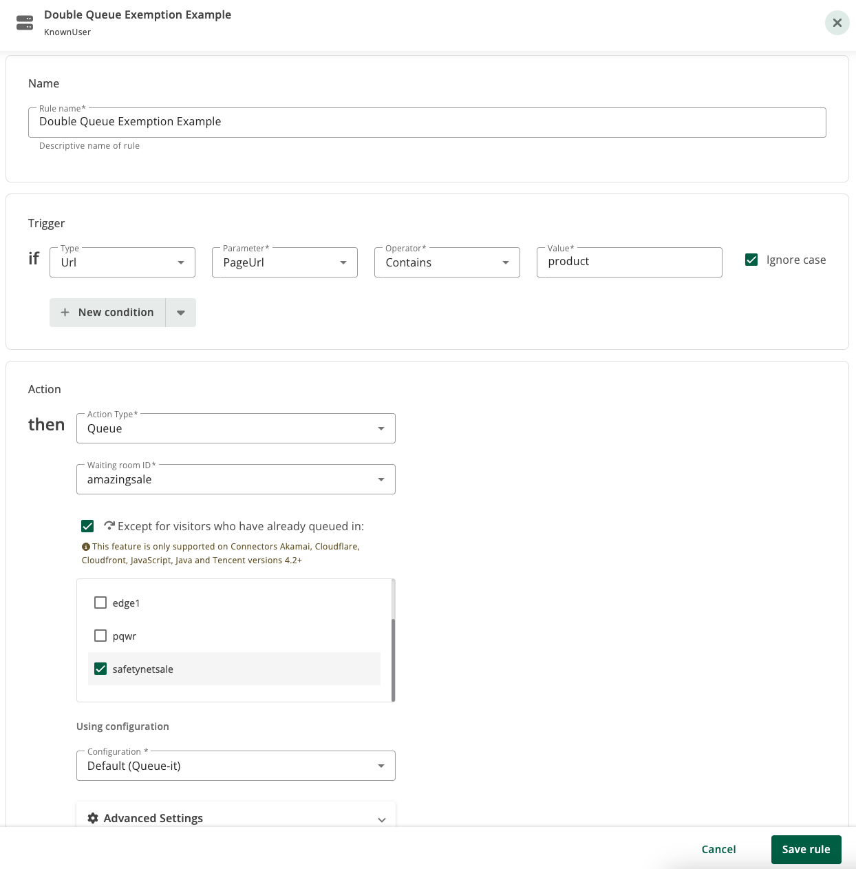For customers using Connectors v4.2+ (Akamai, CloudFront, Cloudflare, Tencent, JavaScript (server), Java) or higher, Double Queue Exemption streamlines interactions by eliminating unnecessary queuing while enabling smoother operations. This feature helps you manage multiple waiting rooms efficiently and fairly, even during high-demand events.